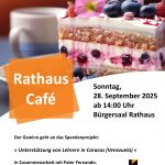 - Herzliche Einladung zum Rathauscafé der Kolpingsfamilie am Sonntag, 28.09.2024 im Bürgersaal/Rathaus.Der gesamte Erlös geht zugunsten unseres Spendenprojektes (Flyer zum Spendenprojekt am Schriftenstand der Kirche) – zu Händen Pater Fernando „Unterstützung Lehrer in Caracas“. Bitte unterstützt unsere Arbeit und genießt gleichzeitig einen entspannten Cafénachmittag mit leckerem Kuchen, unserem Kolpingkaffee und anderen Getränken und netten Gesprächen. Wir freuen uns auf euch, eure Kolpingsfamilie Ottenbach